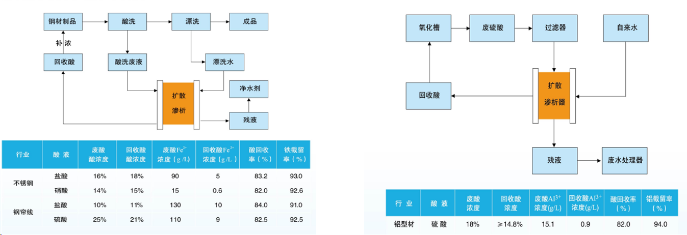 同時根據電中性要求,也會夾帶帶正電荷的離子,由于H+的水化半徑比較小,電荷較少;而鋁鹽的水化離子半徑較大,又是高價的,因此H+會優先通過膜,這樣廢液中的酸就會被分離出來。由于采用逆流操作,在廢液出口處,酸室中的游離酸雖因擴散而大大降低濃度,仍比進口水中游離酸的濃度高,加上實際做膜時,可以通過側基取代控制膜的含水量和孔徑。